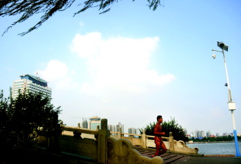 经过几场秋雨的冲刷,德州空气质量较上月明显好转,蓝天白云天数显著增多。8月18日,市区秋高气爽,明月湖风景区内练习长跑的市民在蓝天白云下跑过。 本报记者 马志勇 摄