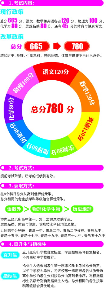 中考从现行的七科总分665分提高至八科总分780分。其中,原有的语数外、物理、化学分数不变,总分80分的思想品德和总分45分的体育与健康两项不再计入总分;新增加历史、地理、生物三科,每科80分,计入总分。