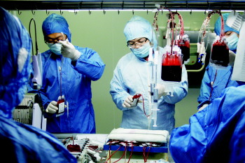 山东省脐血库工作人员将细胞保护剂注入脐血袋。