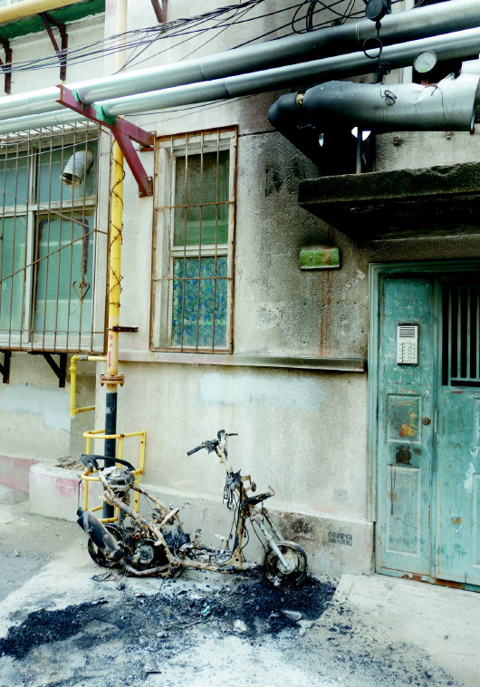 19日上午,记者赶到洪楼小区57号楼外的事发现场时,只见一辆被烧得只剩下铁架的摩托车斜靠在3单元楼门口,旁边还有一堆摩托车没有烧尽的残骸。该单元楼从一楼到三楼的外墙都被熏得乌黑,楼门口避雨台上的电线、燃气管道、暖气管道都被熏黑。