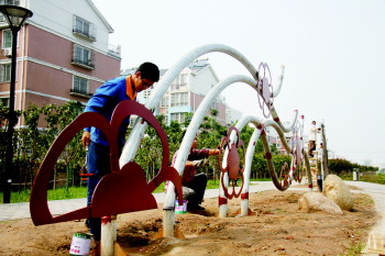8月19日,东沟改造工程已进入收尾阶段,工作人员在为以樱花为主题的铁艺小品刷漆添彩。 本报记者 王小会 摄