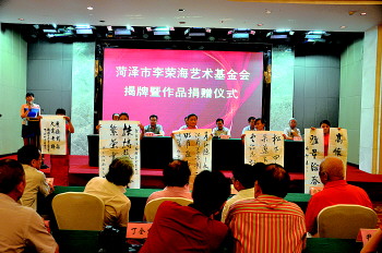 本报菏泽8月19日讯(记者 李德领) 19日,菏泽市李荣海艺术基金会揭牌暨作品捐赠仪式举行,该基金会将对生活困难的艺术家们给予帮助,对有书画艺术天赋的青年才俊们给予鼓励。并将在菏泽的书画界充分发挥救助、奖励、示范和推动作用,进一步推动菏泽文化产业大发展、大繁荣。