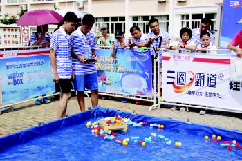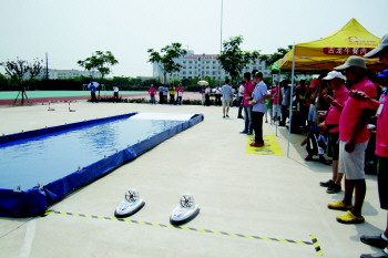 在黄岛区第三实验小学的另一个比赛场地,选手们正在进行“希望号”遥控两栖气垫船模型越野赛。气垫船模型在选手的遥控下,要完成陆上起航、穿门、越过跳台、水面航行和冲线等任务。每名选手进行两轮竞赛,取两轮中最好得分评定成绩。