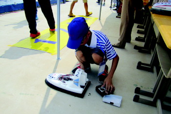 参赛前,一名小选手正对气垫船模型进行最后的检查。
