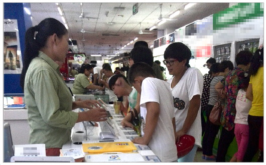 电子、数码产品依旧是学生们追捧的对象,对于一些准大学生来说电脑、手机是最大的消费,而学生们选购电子产品越来越品牌化和广告化,记者粗略计算一下,买一部手机和一台电脑需要花费近5000元。记者看到,每个品牌的手机专柜上都会有一两名学生购物者,一些名牌专柜的样机试机处更是人头攒动。