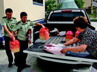 日前,环翠区孙家疃街道山东社区前往辖区边防派出所,为边防民警送去鸡蛋、猪肉等慰问品。