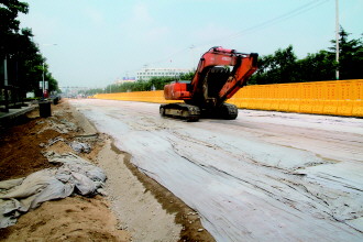 19日上午,机械车辆正在乳山市深圳路道路改造工程现场对二次铺设的路面进行修整。目前,乳山市深圳路(开发街—胜利街)道路改造工程过半,改造工程涉及道路总长2783.8米,总面积116280平方米,预计10月底可完工。