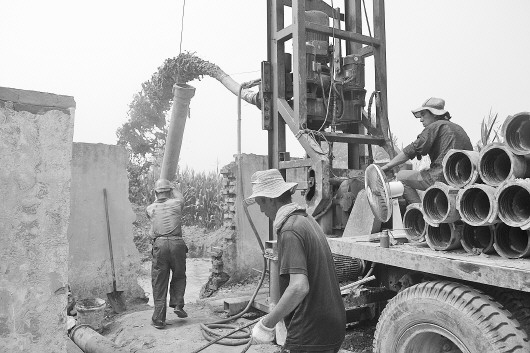 钻机开动,进展迅速,钻机不断将长约2米、直径十几厘米的钻杆下到地下。一根碗口粗的管子架在钻机前端,在巨大的轰鸣声中,源源不断地将井下的泥浆喷入沉淀池,泥浆沉淀过滤后再流回钻孔内循环使用。为增加钻杆的密封性,工人们在钻杆的顶部抹上了润滑油。记者注意到,由于此处地处平原,钻机钻出来的都是泥土。随着钻杆的不断增加,打井深度也在不断加深。