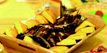 咸鱼饼子是从沿海的渔民流传下来的,出海吃咸鱼饼子图个省事、方便。新鲜的海鱼,在海边晾干,烤得外焦里嫩,和香喷喷的玉米面饼子一起下肚,饼子焦、脆、香,咸鱼鲜、嫩、咸,怕是满汉全席也难敌其独特的风味。目前,这道名吃在蓬莱抹直口社区各饼子店、餐馆内卖得十分火爆,值得尝尝。