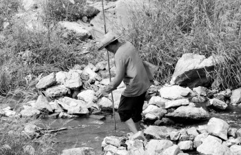 8月20日,在运河下游,一位老人赤脚去捡拾河流中遗弃的塑料瓶。 本报记者 马志勇 摄
