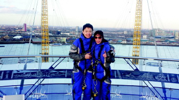 刘与丈夫一起攀岩到英国小巨蛋02的顶端。