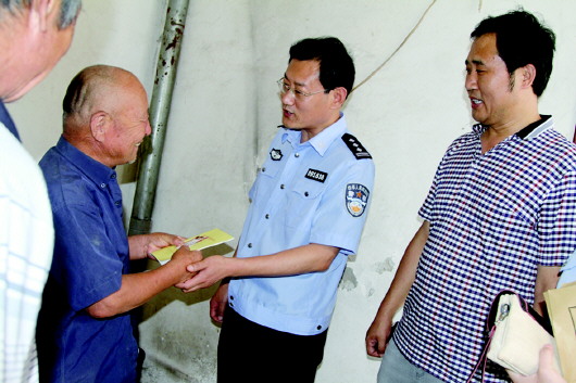 惠民县公安局党委书记、局长刘建忠(右二)与王清华(右一)在柏吕村开展党员联户工作,征求意见。