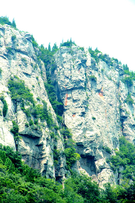 山的东侧石峰林立,奇绝无比,转到山的西侧半山腰,猛一抬头,景色再次让人惊叹。这里居然和东面的景致完全不同!在东侧,整个山体有一定的坡度。而在山西侧,则是一面断崖,恰似一堵高高的石墙,挡在人们面前。