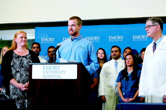 21日,在美国亚特兰大埃默里大学医院,33岁的美国医生布兰特利(中)与妻子安伯(左一)和埃默里大学医院传染病科主任里布纳(右一)一起出席新闻发布会。 新华/法新