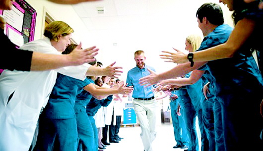 21日,布兰特利出院时与医务人员击掌庆祝。