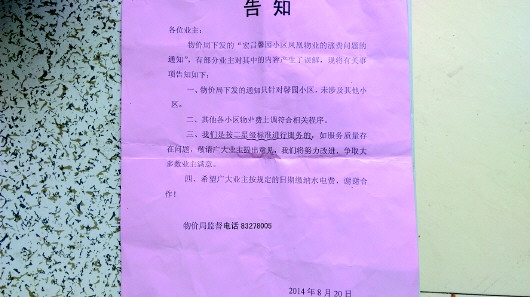 8月20日,宏昌小区物业发出“告知”表示,物价局下发的《通知》只针对馨园小区,未涉及其他小区,其他小区物业费上调符合相关规定。并表示宏昌小区物业是按二星级标准进行服务的。