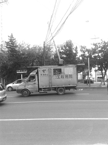 ◤25日,中国电信的施工人员正在环山路抢修线缆。 本报记者 王钦帅 摄