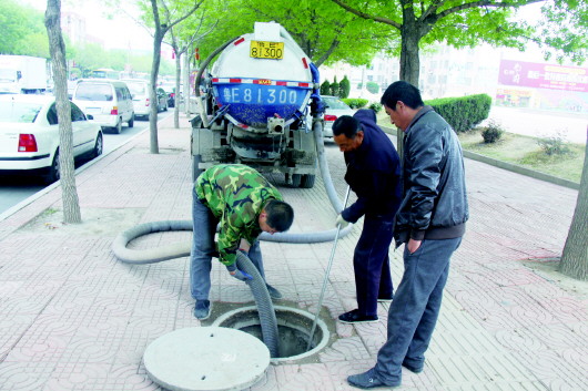 在检查井清淤工作中,聘请专业清淤队伍,调用集吸污、收集、中转运输于一体的清疏吸污车等先进设备投入清淤作业。对于部分堵塞严重、施工难度较大的管道清淤,采用车辆疏通、人工清掏的方式。为确保安全,在新城区民生街、棣新七路及老城区中心大街等多条道路下水道井盖安装防坠网1000余套。