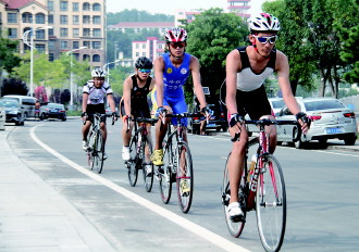铁三爱好者在进行自行车半程训练。记者 陈乃彰 摄