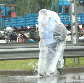 时间:2014年8月14日 自述:下雨天没带雨伞,这位兄弟就用一个特大的塑料袋,把自己全身套在里面,一路前行! 点评:没带雨具,雨中急中生智。