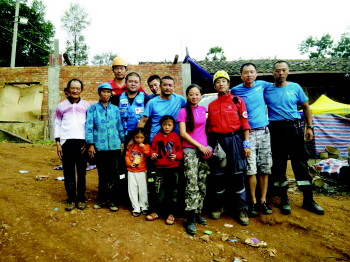 蓝天救援队部分救灾队员在灾区的一张合照。