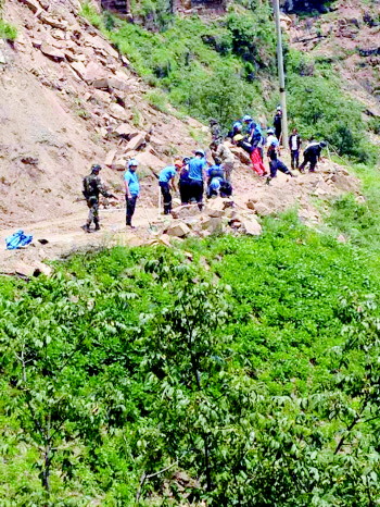 次日上午,“十号”和丽江1名队友先行前往王家坡村摸排地形,如同废墟的村落让他们触目惊心。由于路况崎岖,车辆无法通行,蓝天救援队共18名队员徒步5、6个小时进村帮助王家坡村民挖掘失踪被埋村民和贵重物品。搜救工作往往在一个区域内进行一整天,晚上再返回营地。
