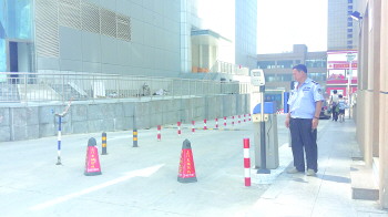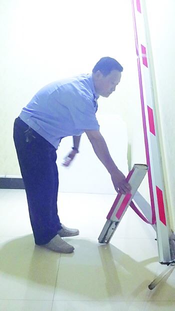 ◥被撞断的门禁升降杆被放置在小区物业公司内。 本报记者 蒋大伟 摄