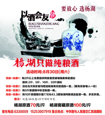 想储藏纯粮酒,抓紧报名。周六本报将组织藏酒团,前往杨湖酒业,储存秉承酿酒古法酿造的纯粮酒。26日是杨湖酒业度夏后开班第一天,记者了解到,因为度夏休班,本次藏酒藏酒团成员可存到最优质的纯粮酒。