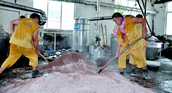 8月26日,是杨湖酒业度夏后开办的第一天。记者走进杨湖酒厂,除了醒目的“永远只做纯粮酒”标语外,还有浓郁的酒糟味道,香气沁入身心。在酿酒车间,酿酒工人们秉承传统酿酒古法,在蒸馏的雾气中,一个个挥汗如雨。
