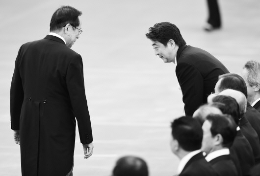 ◥8月15日,在“全国战殁者追悼仪式”上,安倍晋三跟福田康夫打招呼。福田曾在2012选举中以自己退选的方式帮助安倍获选自民党总裁,安倍视福田为“前辈”。