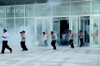 第20届鲁台经贸洽谈会临近,展会已进入布展阶段。27日上午,在鲁台会展中心举行了消防模拟演练,随着一声令下,鲁台会馆门前冒出模拟火灾的浓烟,现场安保人员和潍城区消防大队消防人员立即采取扑救行动,场馆内的工作人员也在安保人员的组织下有序撤离场馆。