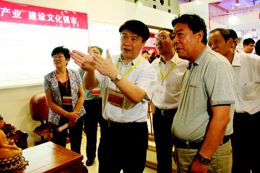在滨州展区,姜异康被京博10名身着戏服的小朋友所吸引,他们正在演唱吕剧《借亲》中的《马大宝喝醉了酒》经典选段。姜异康握住孩子们和老师的手说:“滨州在传承吕剧文化上做得很好,经典文化的传承,要从娃娃抓起。”姜异康饶有兴趣地参观了滨州阳信鲁木匠古典家具有限公司打造的精品家具,当听到总经理刘景哲讲述了自己研究创作的“硕士摇篮”的创意后非常赞赏,“不仅传承了古典家具的文化,而且产品非常实用,实现了传统文化艺术性与实用性的结合。”