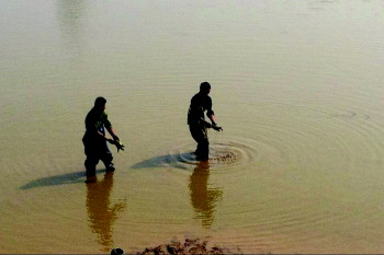 工作人员正在冠县贠庄马颊河湿地捕捞原生态野生甲鱼