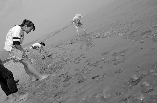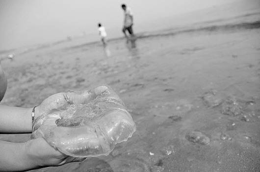 本报烟台8月31日讯(记者 聂子杰) 虽然炎热的8月接近尾声,仍有不少市民和游客来到海水浴场游泳,或在沙滩上享受凉爽的海风。不过,8月30日烟台大学海水浴场附近突然开始出现大量水母,严重时游客甚至无处下脚。