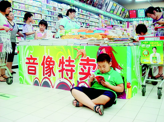 在济南某超市,一个小男孩在图书卖场的一个角落读书。为了避暑,不少爱读书的小朋友来到空调开放的超市里“蹭书”看,既清凉,又惬意。