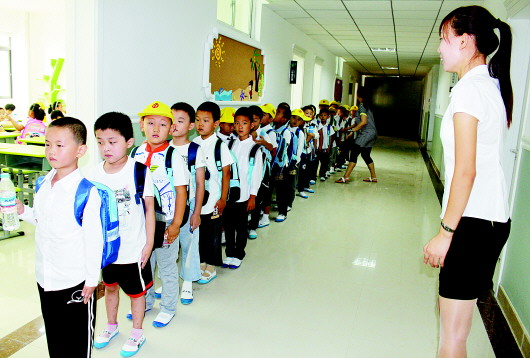 8月31日上午,天桥区宝华小学新生报到,老师组织一年级新生在走廊上按照身高排座位。经过各方努力,学校提前一年交付使用,300多名一年级新生成为首批幸运儿。 本报记者 李飞 摄