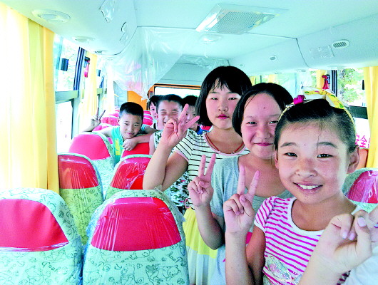 ▲孩子们坐在新校车里,高兴地伸出了剪刀手。