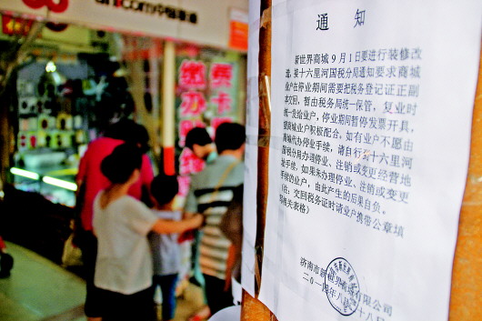 8月31日18点30分,热闹非凡的英雄山新世界商城落下卷帘门,大门口贴着停业的通告。此后该商城将整修一年,重点是消防设施。关门前商户们进行了甩卖,也有部分商户开始撤柜。