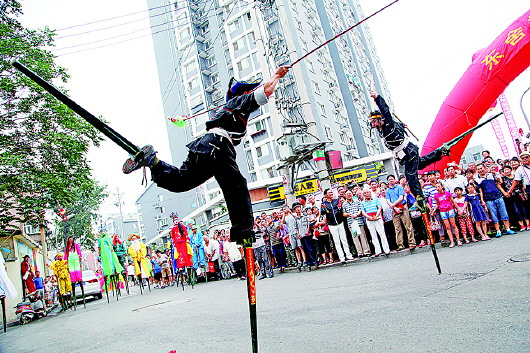 伴随着震天响的锣鼓,高跷队员们踩着高跷,从社区里走来。8月31日,东舍坊高跷会揭牌仪式在东舍坊小区举行。  本报记者 许建立 通讯员 白洋 摄影报道