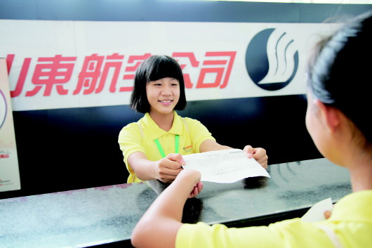 8月22日,山航营销委邀请20名旅客子女代表来到济南遥墙国际机场,以角色扮演的形式体验了航空业的运营服务流程,使孩子们经历了一次精彩的“航空探秘之旅”。 (龚凌云)