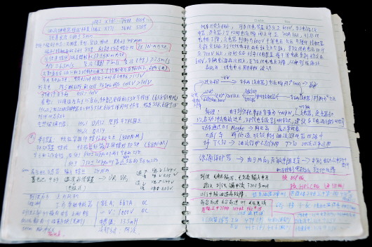 能够如此迅速地成长为电力电气检修组的技术性骨干,与齐本祥的细心、勤奋、扎实以及始终有着一股爱钻研的劲儿分不开。在采访过程中,小齐在介绍每次维修细节的时候都会细心查阅自己的三本笔记本,生怕出一点纰漏。这三本笔记本无一例外都被小齐写得密密麻麻的。其中有一个小笔记本随时装在工装的上口袋中,里面还夹着一支笔,以备随时记录。这个小笔记本已经被翻阅出了“古董味”,纸质已经发软,边缘已经残破。