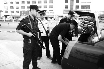 8月29日,在位于岚山的绣针河治安检查站,日照市公安特警支队的特警战士们荷枪实弹,24小时盘查可疑车辆。