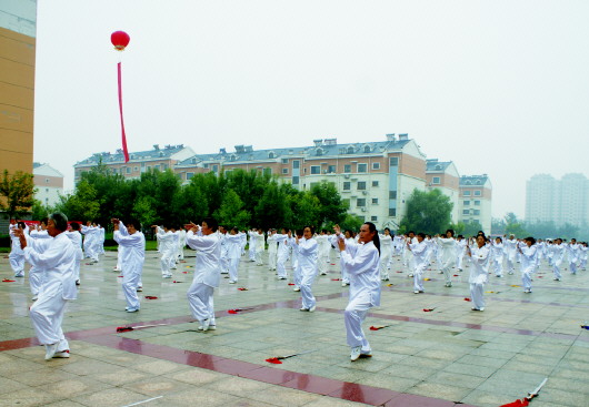 为贯彻党的十八大关于推广全面健身的有关要求,山东省武术协会于今年8月至11月组织了“太极齐鲁行”——山东太极健身公益活动(试点)。8月31日一大早,千人太极展演在滨州市政府广场举办,滨州市1000名太极爱好者集中展示了24式太极拳、42式太极拳、32式太极剑、42式太极剑等。