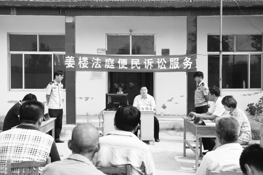 为方便群众诉讼,真正将司法为民的要求落到实处,惠民县法院坚持便民诉讼联络制度,每周安排各基层法庭法官深入便民诉讼服务站点实行就地立案、就地调解、就地审判,并现场提供法律咨询服务,全面推动了中心下移、服务前移。图为该院法官深入姜楼镇姜家村便民诉讼服务点开庭审理一起离婚案件。