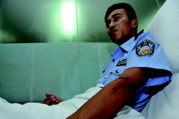 右图:目前,受伤的协警杨攀正在淄博市中心医院接受进一步治疗。