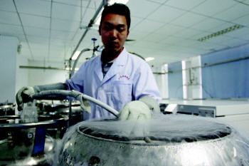 省脐血库工作人员将液氮注入临时储罐内。
