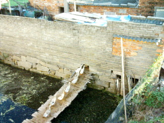 时间:2014年8月26日 自述:一户人家在自家的后墙挖了个小洞,洞口和屋后池塘之间架了个小桥。可算是别具一格的水鸭专用通道。 点评:专洞专用。