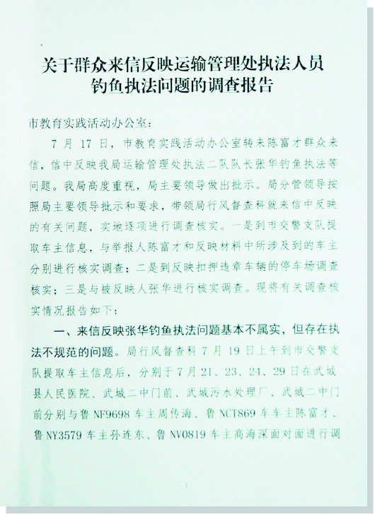 该局出具了一份《关于群众来信反映运输管理处执法人员钓鱼执法问题的调查报告》,其中写道,经调查,举报人反映情况基本不实,举报人所反映被钓鱼执法的车辆鲁NY3579、鲁NG5W68车主,被查后因与执法部门界定黑出租载客行为不符,均未被处罚并当场放行。