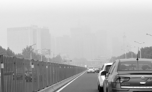 ▲1日,济南全天雾气笼罩,空气质量一度达到中度污染,傍晚转为轻度污染,远处景物隐约可见。 本报记者 周青先 摄