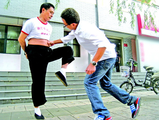 9月1日,在经十路上,一名年轻小伙试图“挑战”谢水平。小伙深吸一口气,退后几步,几记重拳下去,小伙的手背已经发红,甩了甩手,不停地喊疼。即使单腿站立,谢水平却丝毫没动,他说自己根本感觉不到疼。